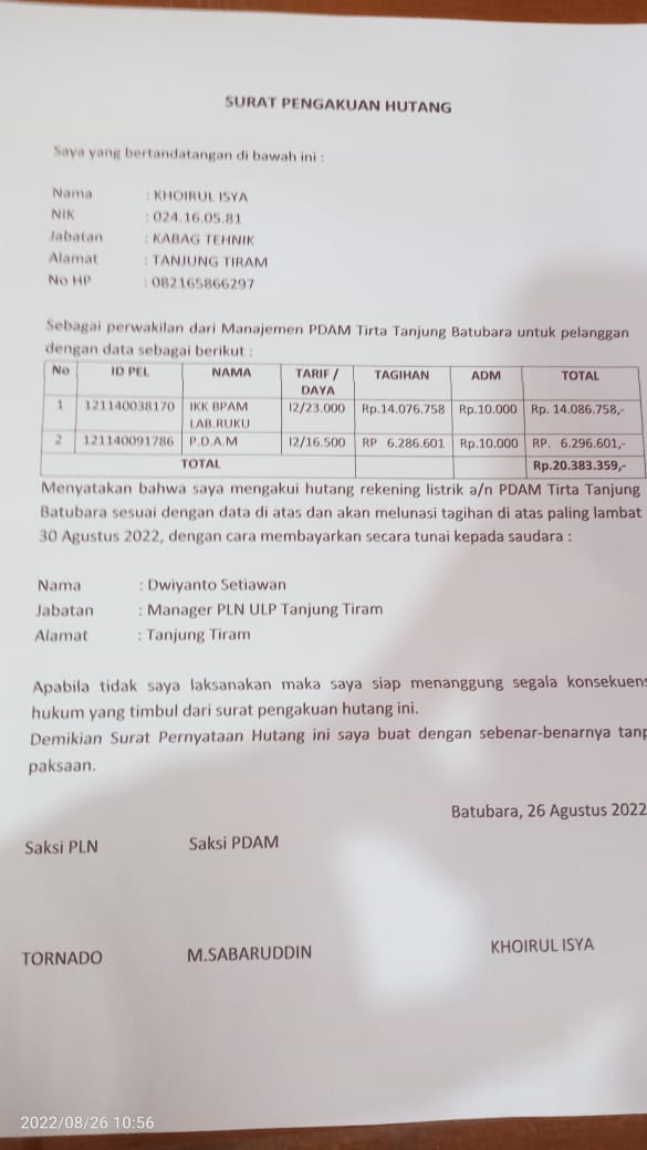 Sebabnya, berdasarkan surat pengakuan hutang yang ditemukan tertanda dari Kabag Tehnik PDAM Tirta Tanjung atas nama inisial “KI” sebagai perwakilan Manajemen PDAM Tirta Tanjung mengakui hutang tagihan rekening listrik atas nama pribadi nya kepada pihak PT PLN ULP Tanjung Tiram dengan no. Id Pel. 121140038170 dan no. Id Pel. 121140091786 dengan total hutang sebesar Rp. 20.383.359,00.- untuk pembayaran rekening listrik PDAM Tirta Tanjung terhitung tanggal 26 Agustus 2022?