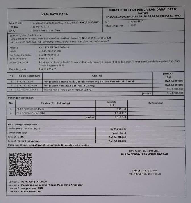 Dari perihal konfirmasi media ini seputar mempertanyakan berapa unit Mesin scanner F4 di beli oleh Badan Pendapatan Daerah pada tahun anggaran 2023 tersebut.