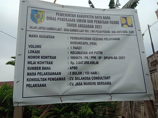 Kasatnews.id , Batu Bara – Menjawab konfirmasi awak media Kasatnews.id atas dugaan tindakan melawan hukum terhadap pembangunan gedung pelayanan Disdukcapil T.A 2021 senilai Rp. 3.647.898.698,00.- yang dikerjakan oleh penyedia jasa CV JMB dengan kontrak nomor 1909676/PK/PPK/SP/DPUPR-BB/2021.